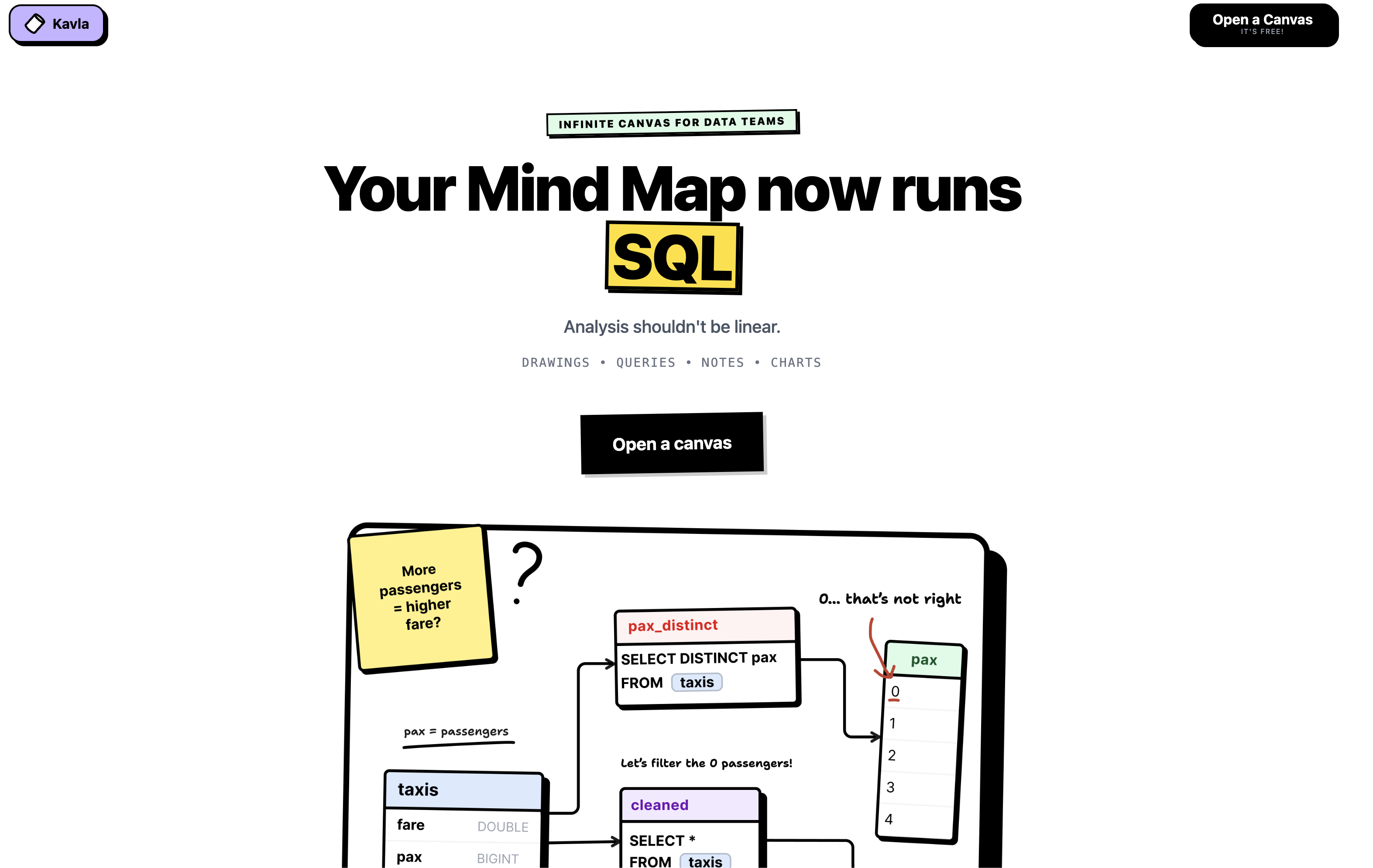 Kavla is an infinite canvas for analytics using duckdb. Using pocketbase for the auth layer